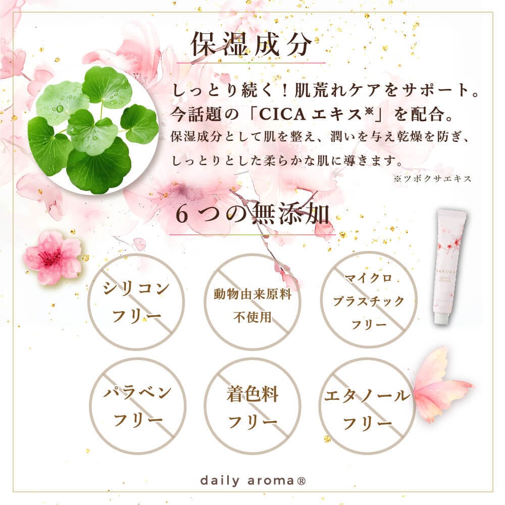 水、ヒマシ油、グリセリン、セタノール、ベヘニルアルコール、ペンタステアリン酸ポリグリセリル-10、シア脂、ソメイヨシノ葉エキス、サトザクラ花エキス、酒粕エキス、パルミチン酸レチノール、酢酸トコフェロール、アスコルビン酸Na、トコフェロール、アブラナ種子油、ヒアルロン酸Na、ステアリン酸グリセリル(SE)、シクロデキストリン、加水分解デンプン、キサンタンガム、ステアロイルラクチレートNa、PEG-60水添ヒマシ油、(アクリレーツ/アクリル酸アルキル(C10-30))クロスポリマー、BG、水酸化K、フェノキシエタノール、香料